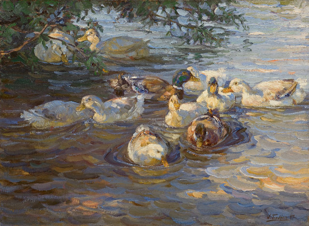 De Duitse schilder Willy Tiedjen maakte landschappen en marines, maar werd vooral bekend als dierschilder. Aan de academie van München, waar hij vanaf 1902 studeerde onder Heinrich von Zügel, specialiseerde hij zich in dit genre. Zijn leermeester had vooral voorkeur voor rundvee, Tiedjen blonk uit in het schilderen van pluimvee, vooral eenden. In impressionistische stijl, met breed penseel en pasteus verfgebruik, schilderde hij talrijke levendige diervoorstellingen en toont hij zich in zowel observatievermogen als weergave van de reflectie van het zonlicht op het water een waardig leerling van Zügel. Na zijn academietijd maakte Willy Tiedjen verschillende studiereizen door Duitsland, Zwitserland en langs de Nederlandse kust. Uiteindelijk vestigde hij zich in München, waar hij actief deelnam aan tentoonstellingen.