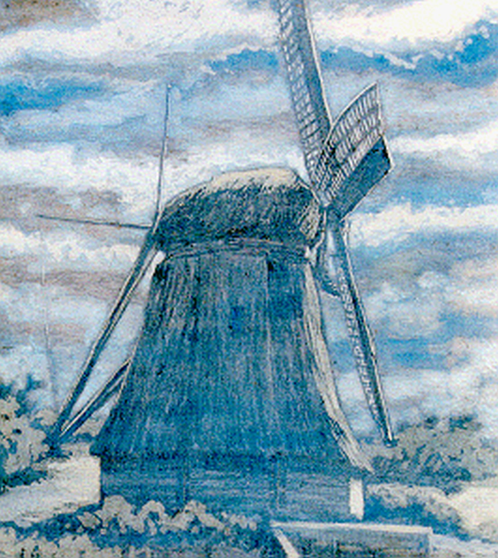 Willy van Schoonhoven van Beurden kunstwerk • aquarel • tekening • voorheen te koop Molen te Diemen bij maanlicht