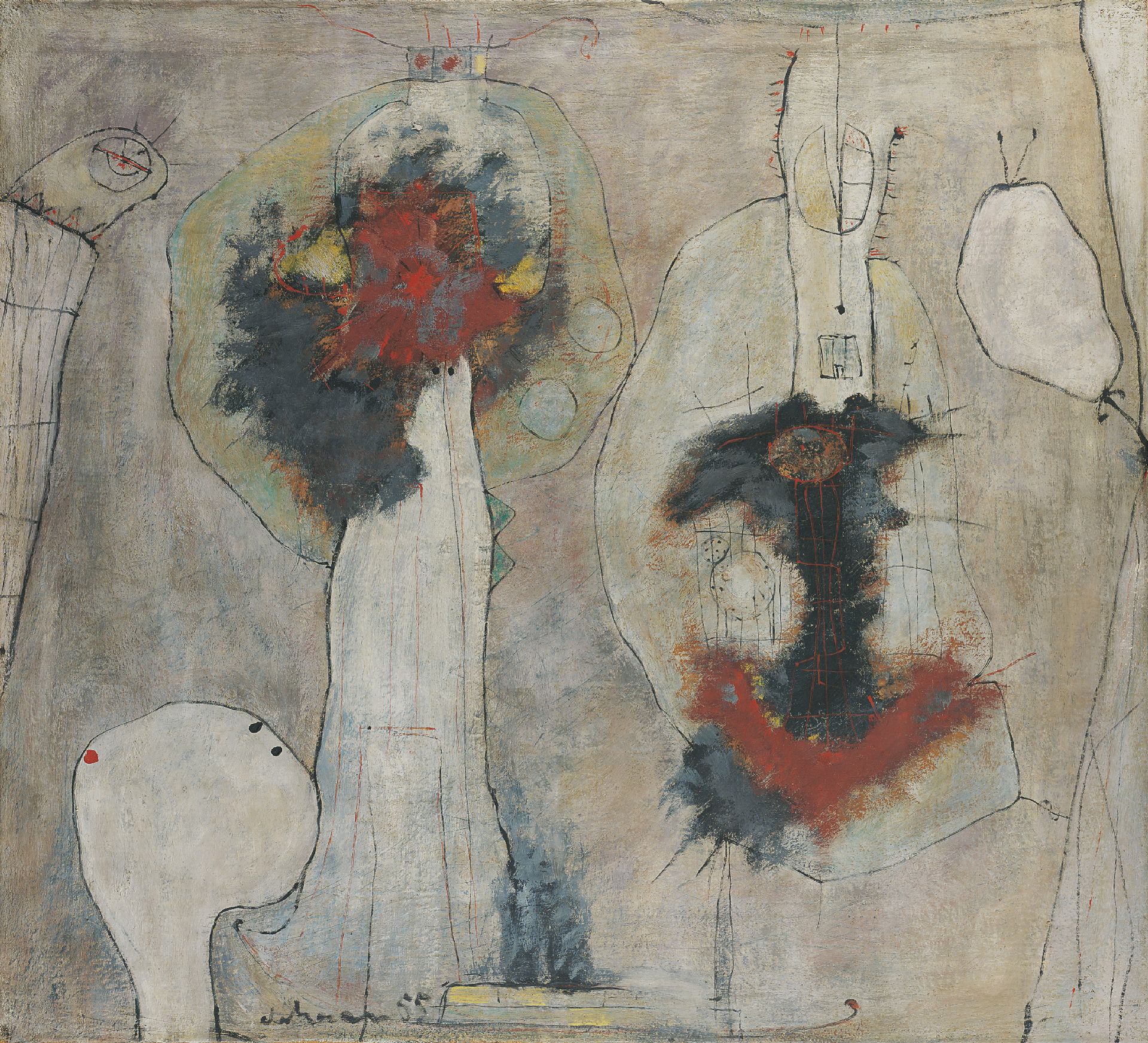 olieverf en as op jute 90,0 x 100,0 cm, gesigneerd links van het midden. en gedateerd '55