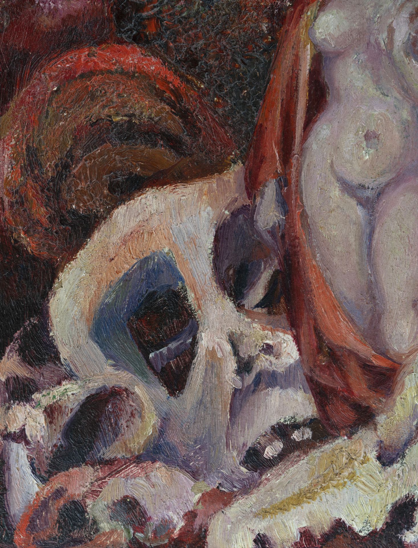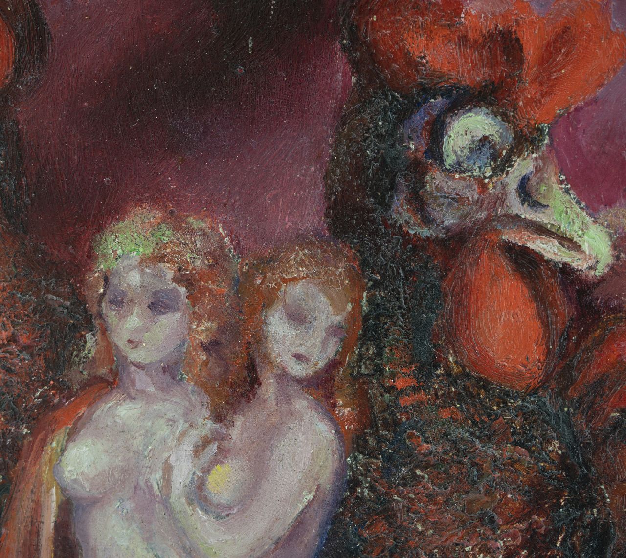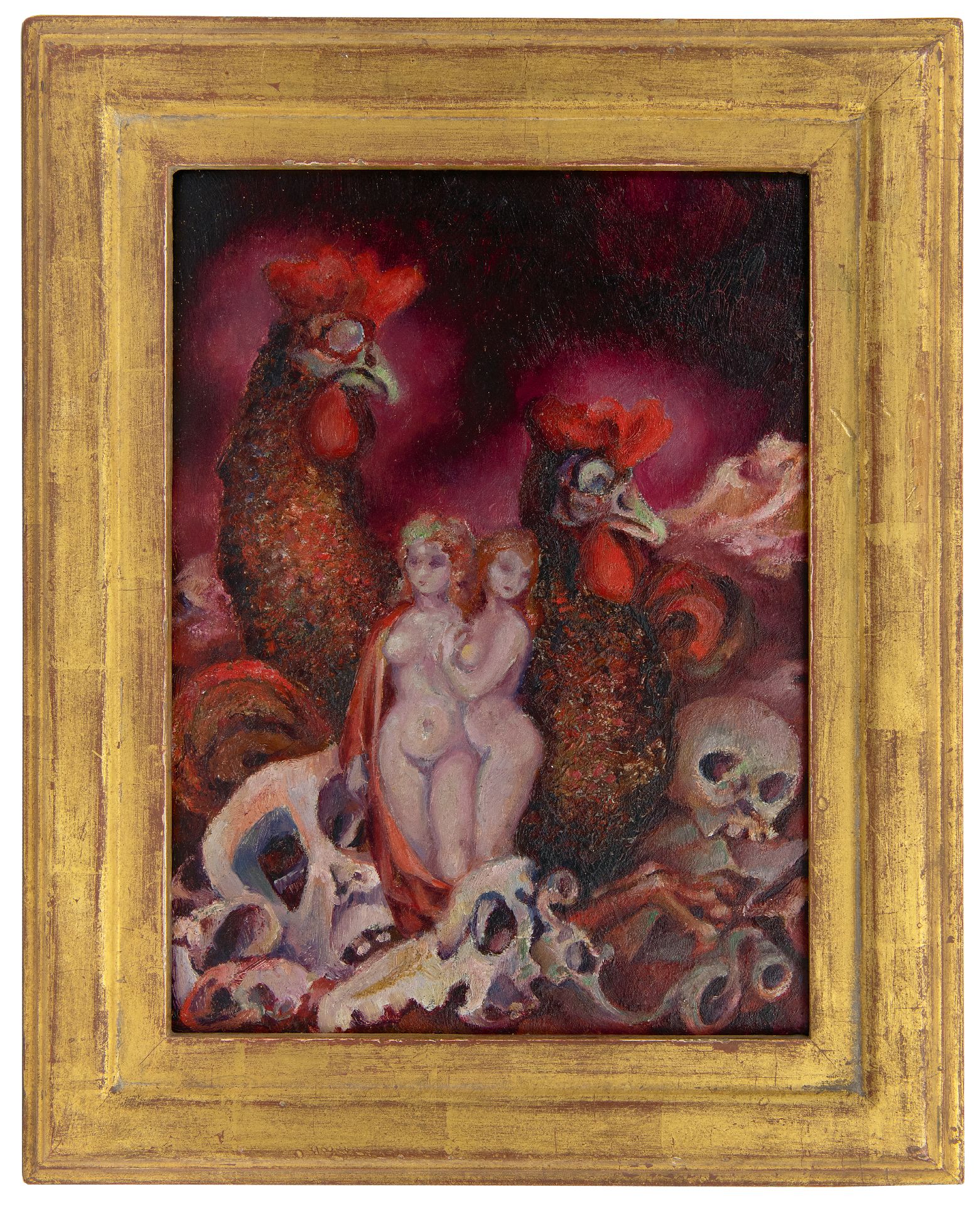 Wim Schippers kunstwerk • schilderij • te koop Twee naakten, schedels en hanen