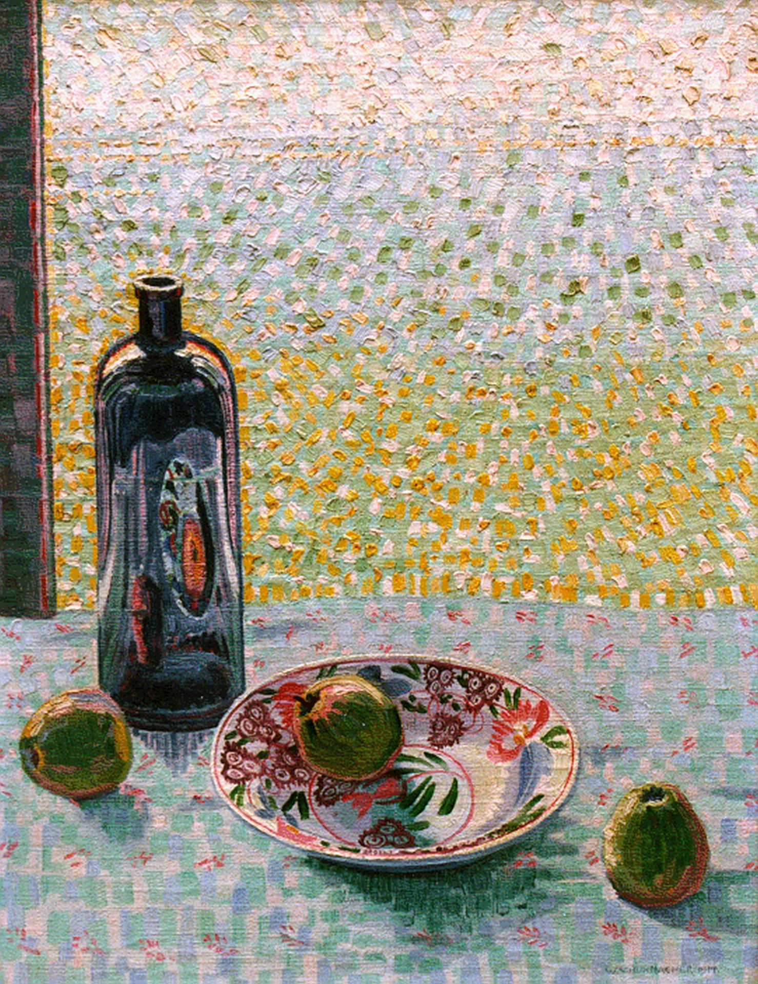 Wim Schuhmacher kunstwerk • schilderij • voorheen te koop Stilleven met fles, bord en appels