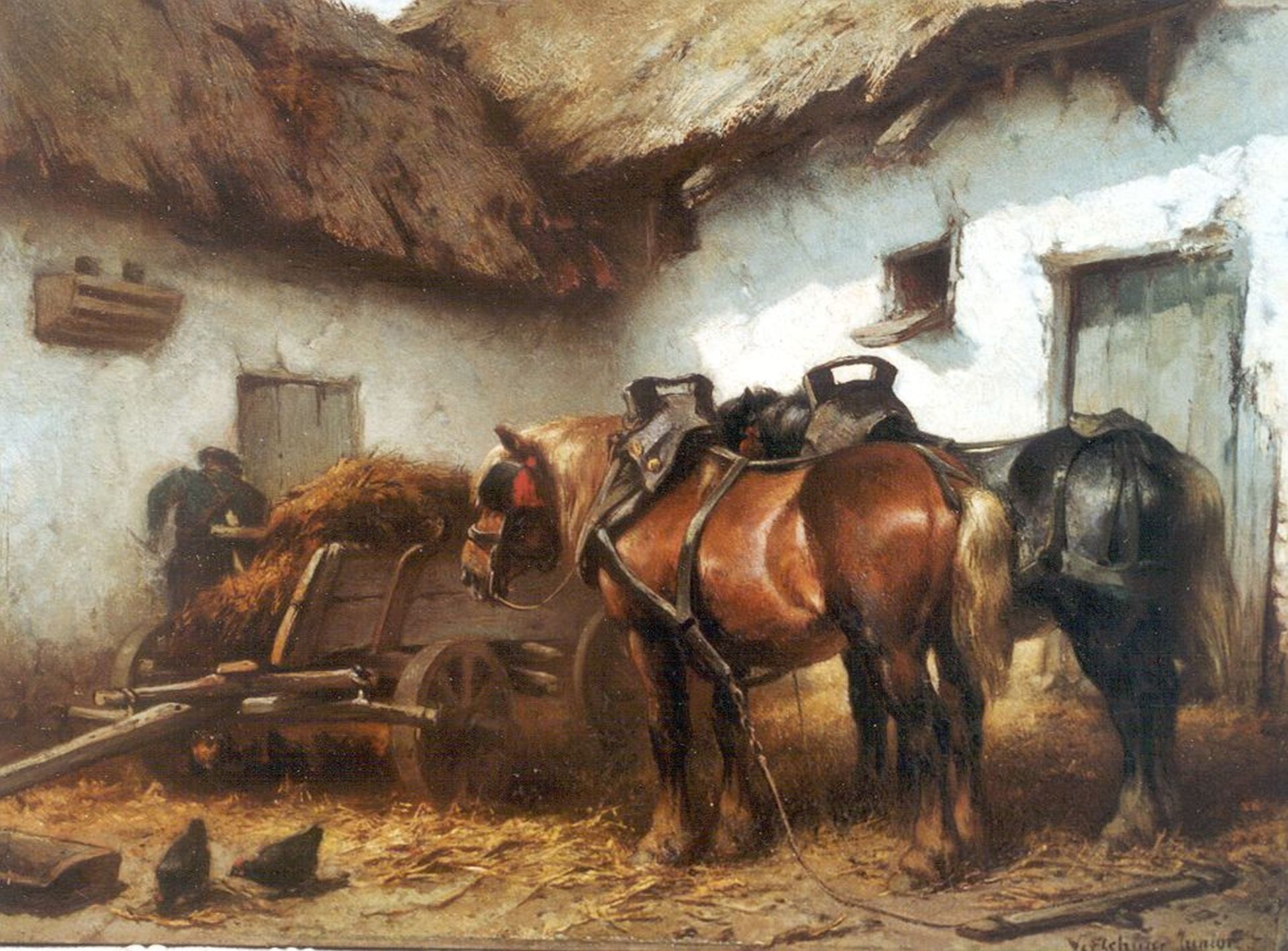 Wouter Verschuur jr. kunstwerk • schilderij • voorheen te koop Boer en werkpaarden op boerenerf
