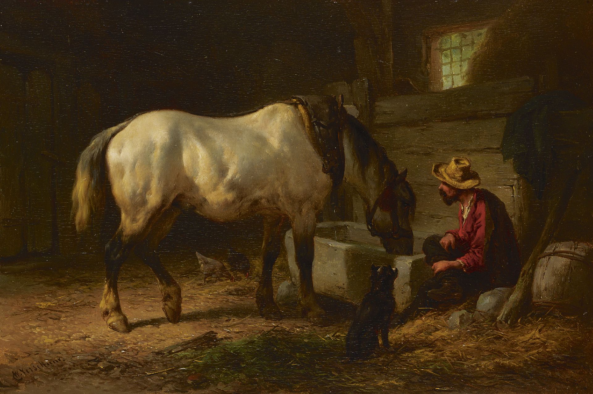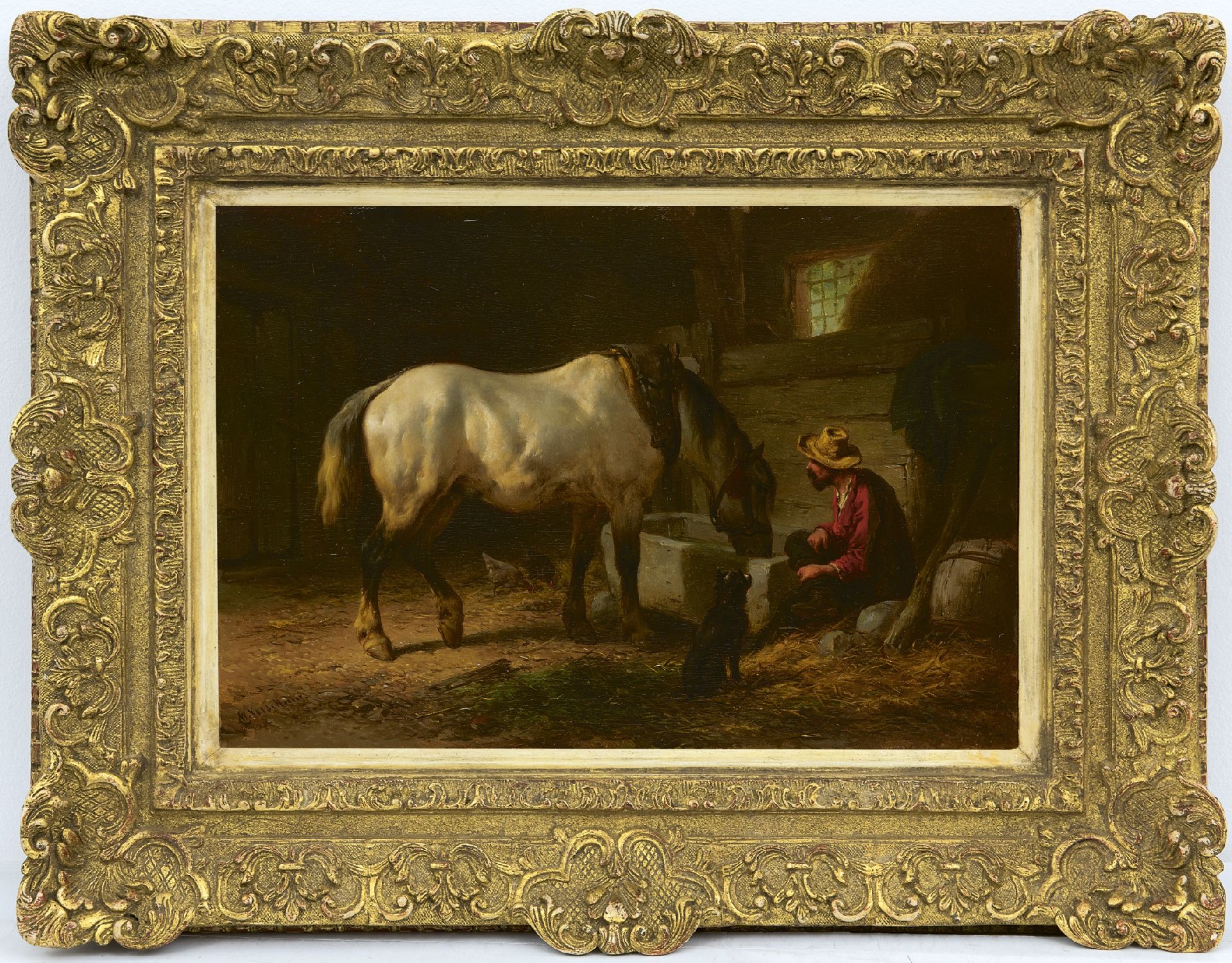 Wouterus Verschuur was in zijn tijd al een beroemd paardenschilder. Van zijn leermeester, de veeschilder P.G. van Os, leerde hij hun bouw en bewegingen tot in de perfectie vast te leggen. Als rechtgeaard romanticus had hij daarnaast belangstelling voor hun karakter. Zo schilderde hij sterke boerenpaarden op stal, ranke rijpaarden tijdens een middagrit en energieke tuigpaarden. Verschuur was ook een knap hondenschilder. Deze dieren komen op de meeste van zijn schilderijen dan ook voor. Tussen 1858 en 1868 woonde de schilder in Haarlem, waar hij les gaf aan Anton Mauve. Ook was hij leermeester van zijn zoon Wouterus jr., die zich eveneens specialiseerde in het schilderen van paarden.
