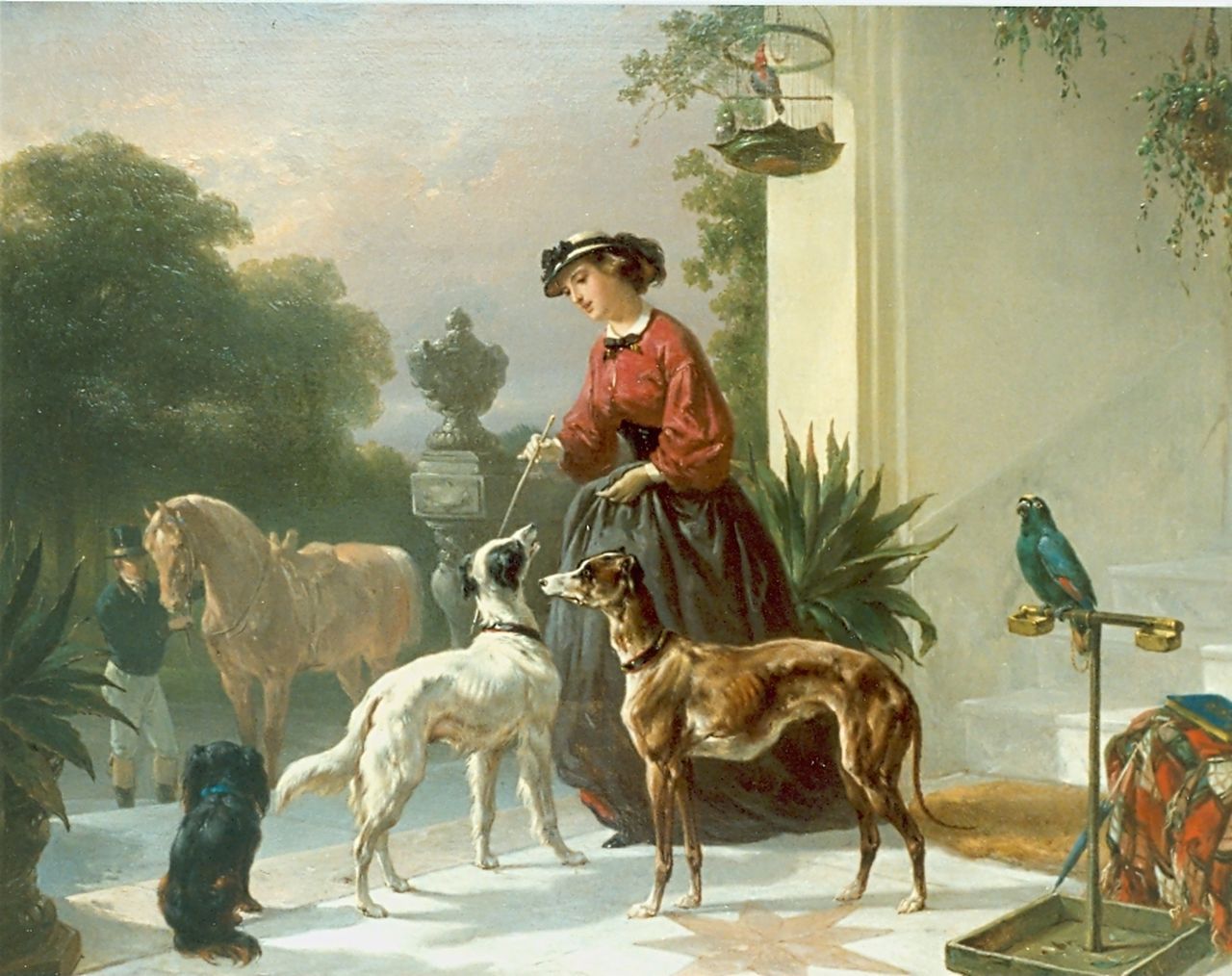 Wouterus Verschuur kunstwerk • schilderij • voorheen te koop Amazone met haar honden en paard op terras