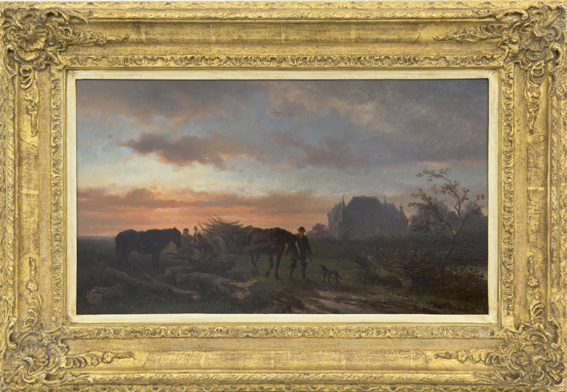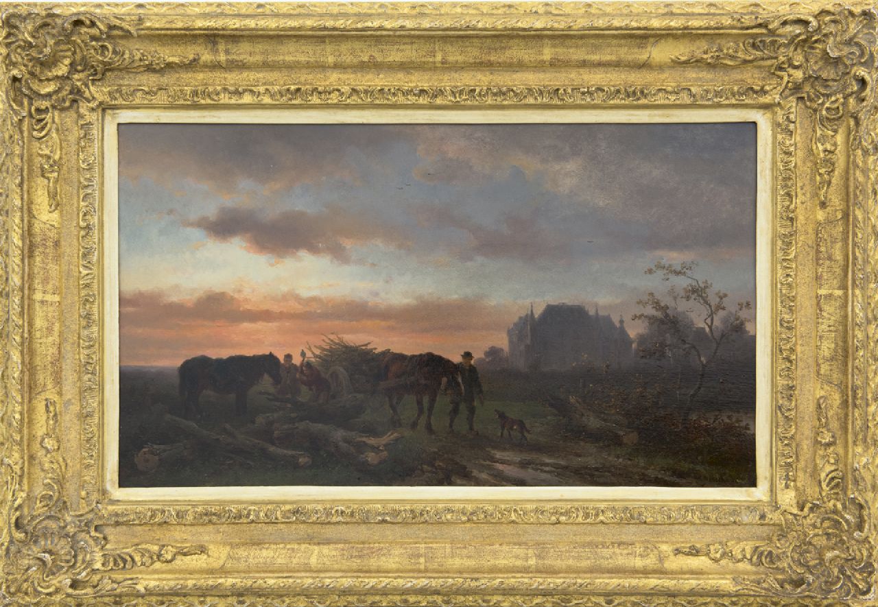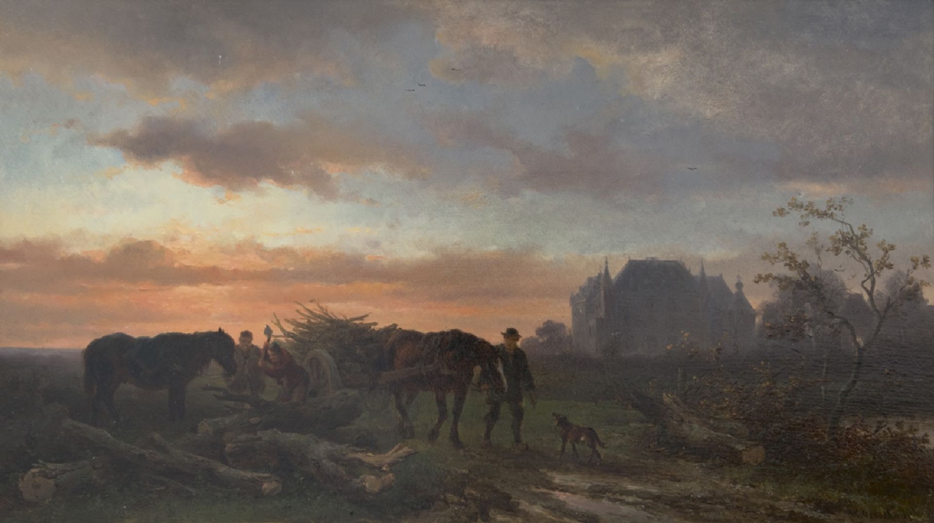 Wouterus Verschuur kunstwerk • schilderij • voorheen te koop Avondlandschap met houthakkers en hun paarden