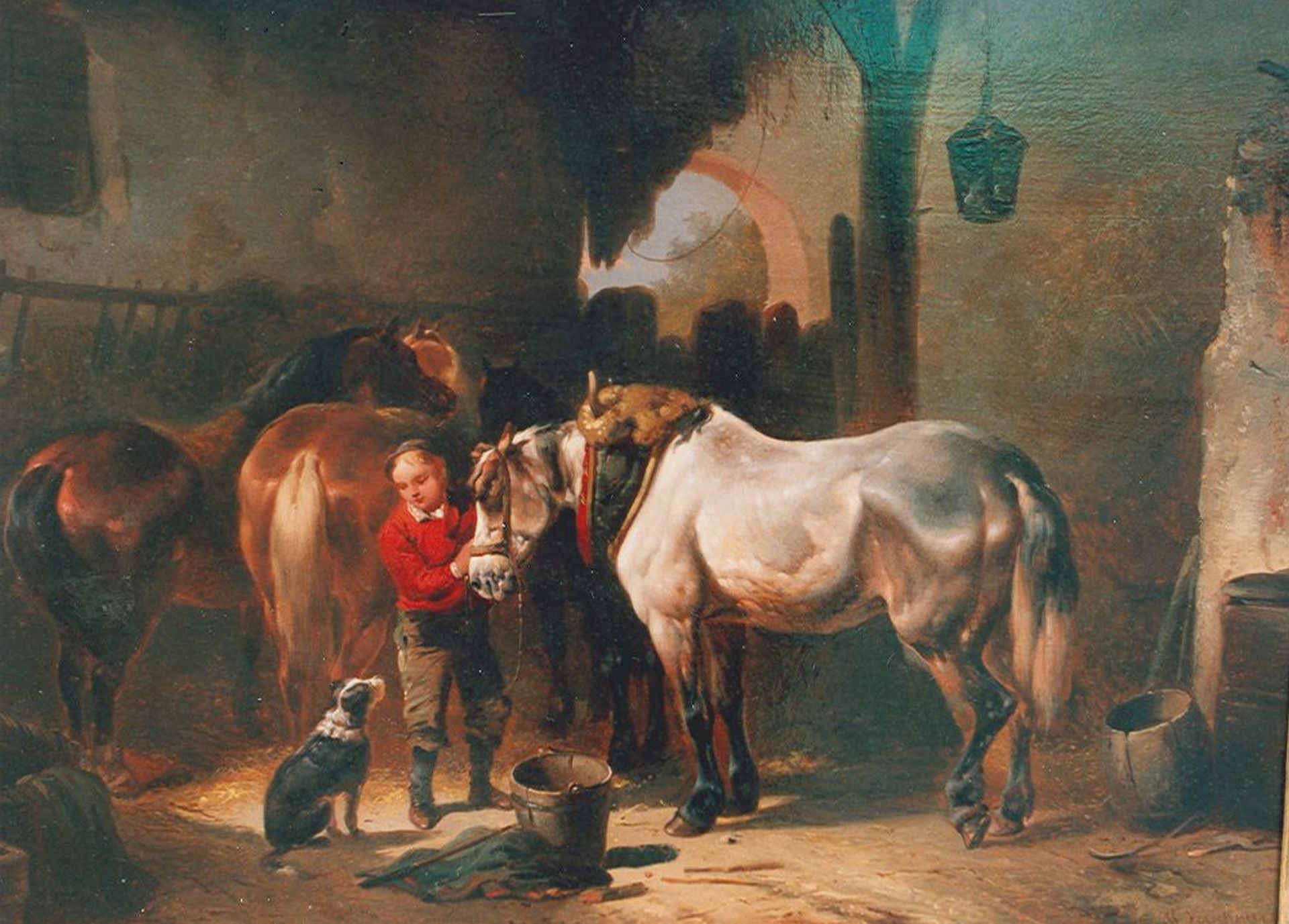 Wouterus Verschuur kunstwerk • schilderij • voorheen te koop Boerenpaarden met knecht en hond in de stal
