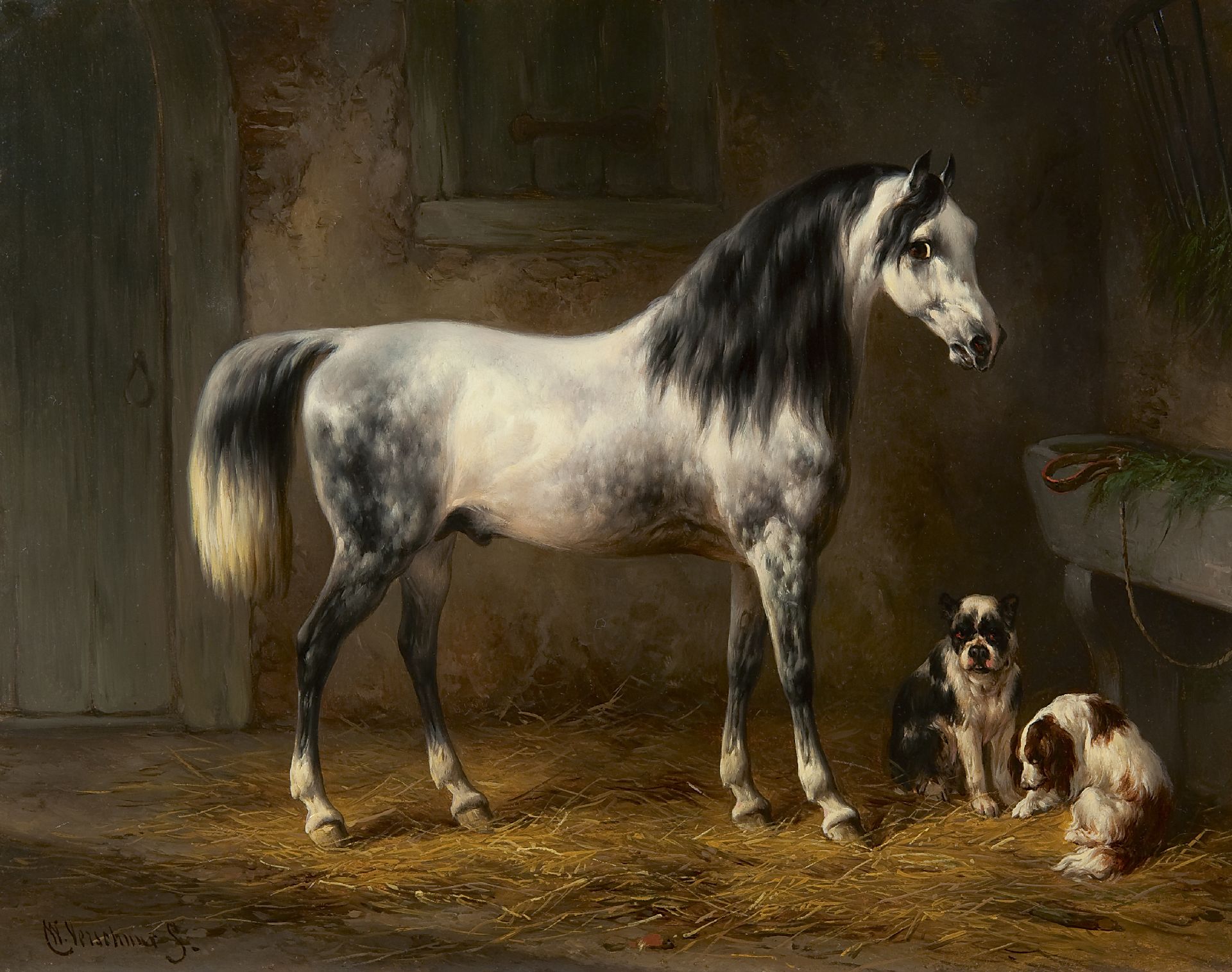 Wouterus Verschuur was in zijn tijd al een beroemd paardenschilder. Van zijn leermeester, de veeschilder P.G. van Os, leerde hij hun bouw en bewegingen tot in de perfectie vast te leggen. Als rechtgeaard romanticus had hij daarnaast belangstelling voor hun karakter. Zo schilderde hij sterke boerenpaarden op stal, ranke rijpaarden tijdens een middagrit en energieke tuigpaarden. Verschuur was ook een knap hondenschilder. Deze dieren komen op de meeste van zijn schilderijen dan ook voor. Tussen 1858 en 1868 woonde de schilder in Haarlem, waar hij les gaf aan Anton Mauve. Ook was hij leermeester van zijn zoon Wouterus jr., die zich eveneens specialiseerde in het schilderen van paarden.