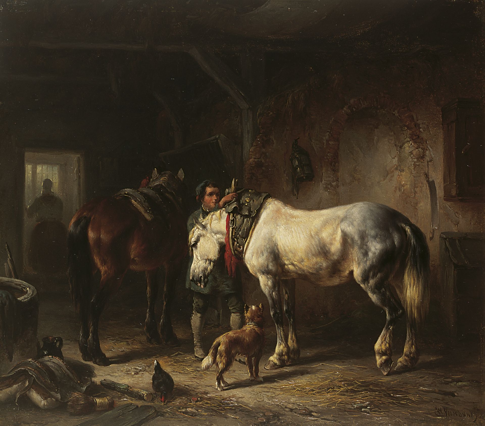 Wouterus Verschuur kunstwerk • schilderij • voorheen te koop Het zadelen van de paarden