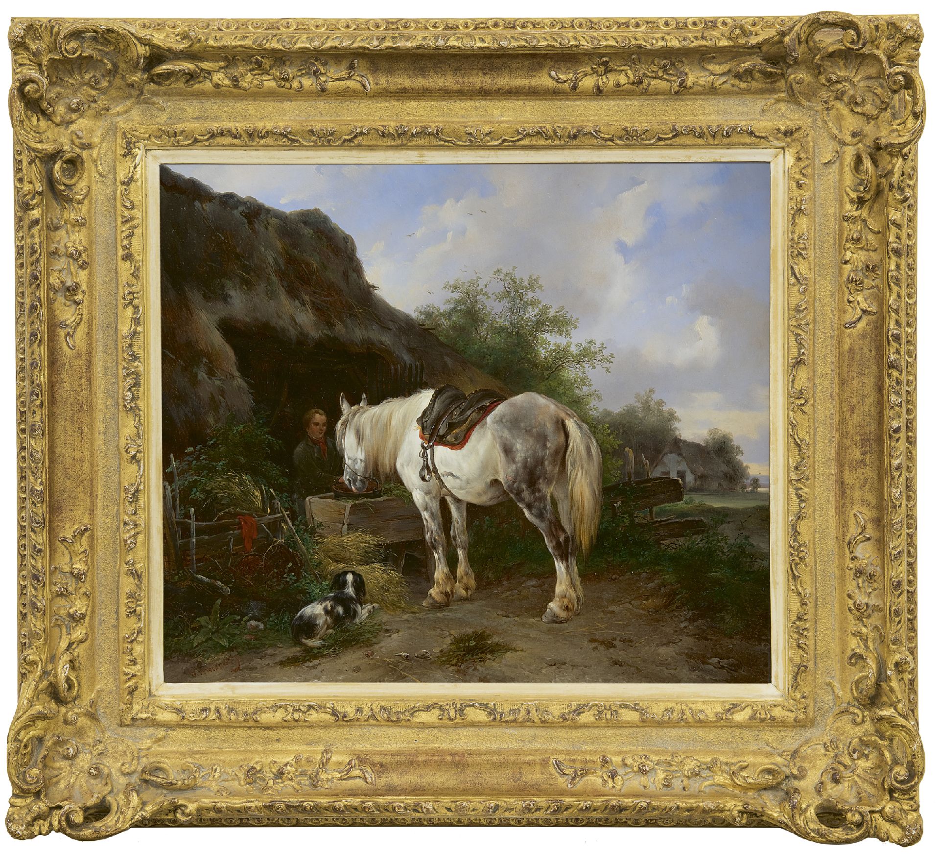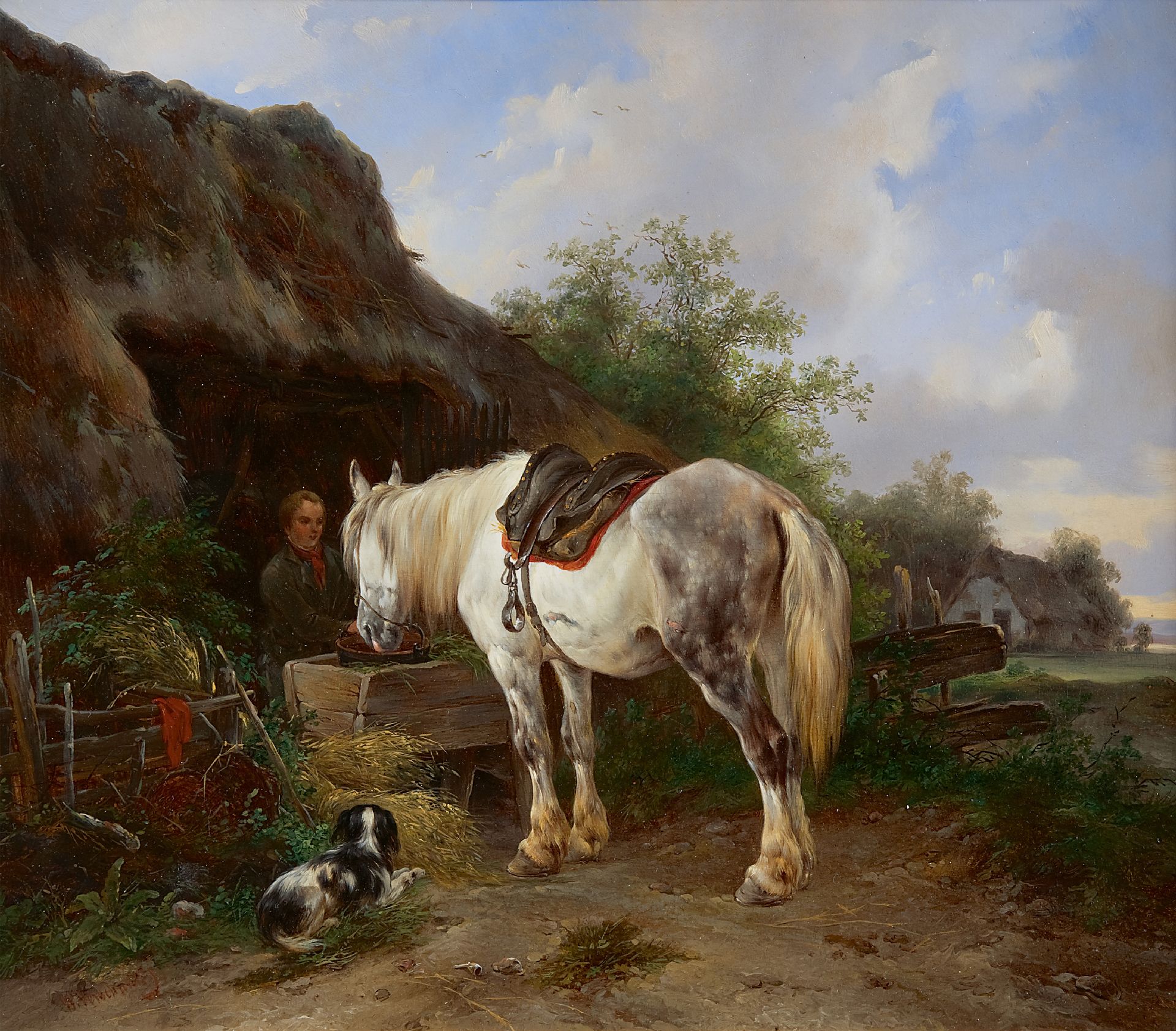 Wouterus Verschuur was in zijn tijd al een beroemd paardenschilder. Van zijn leermeester, de veeschilder P.G. van Os, leerde hij hun bouw en bewegingen tot in de perfectie vast te leggen. Als rechtgeaard romanticus had hij daarnaast belangstelling voor hun karakter. Zo schilderde hij sterke boerenpaarden op stal, ranke rijpaarden tijdens een middagrit en energieke tuigpaarden. Verschuur was ook een knap hondenschilder. Deze dieren komen op de meeste van zijn schilderijen dan ook voor. Tussen 1858 en 1868 woonde de schilder in Haarlem, waar hij les gaf aan Anton Mauve. Ook was hij leermeester van zijn zoon Wouterus jr., die zich eveneens specialiseerde in het schilderen van paarden.