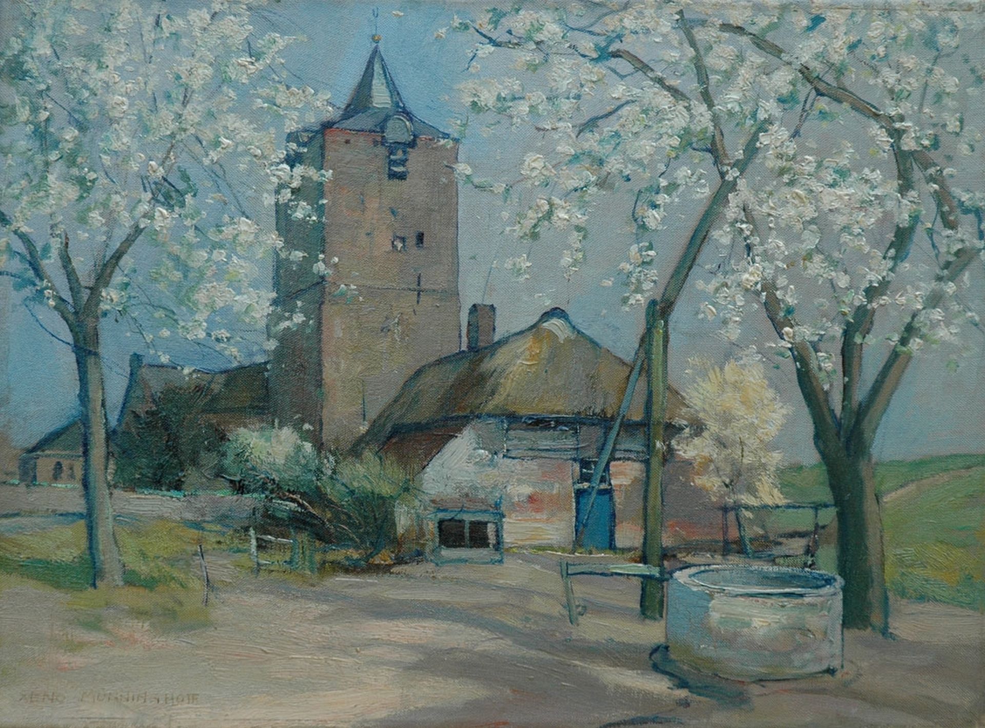 Xeno Münninghoff kunstwerk • schilderij • voorheen te koop Bloesembomen bij Nederlandse Hervormde Kerk, Dodewaard