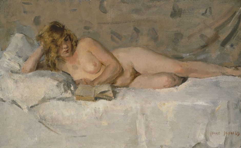 In de tijd van Israëls was het naakt voor velen confronterend, men was nog gewend aan de geïdealiseerde naaktheid zoals deze te zien was bij godinnen en kuise baadsters. Maar nu werd het vrouwelijk naakt niet langer verpakt in allegorische voorstellingen, maar verbeeld als zinnelijk wezen op een lichamelijke, sensuele en intieme manier. A.M.W.J. Hammacher, kunstcriticus en van 1948 tot 1963 directeur van het Kröller-Müller Museum, schreef over het naakt van Israëls: ‘Isaac heeft dat op een welhaast fransche wijze gedaan, zoo verrukkelijk licht, blank en onzwaar, met fijne gratie. (…) De stijl van beheerschte genieting, waar het zieleleven bewust buiten is gehouden. (…) Isaac weet een naakt rank en stil, als een bloemenlijf neer te leggen op een bed in een verzorgde kamer.’ Sjaantje ligt hier lezend op een divan; schijnbaar nonchelant, maar zich ongetwijfeld bewust van de blik van de kunstenaar.