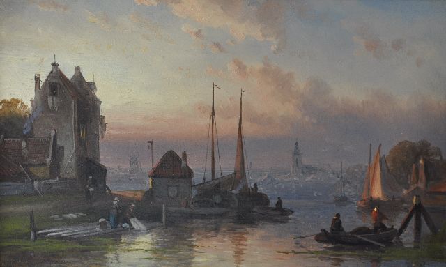 Jacob Abels | Maanverlicht rivierlandschap bij een stad, olieverf op paneel, 28,8 x 39,1 cm