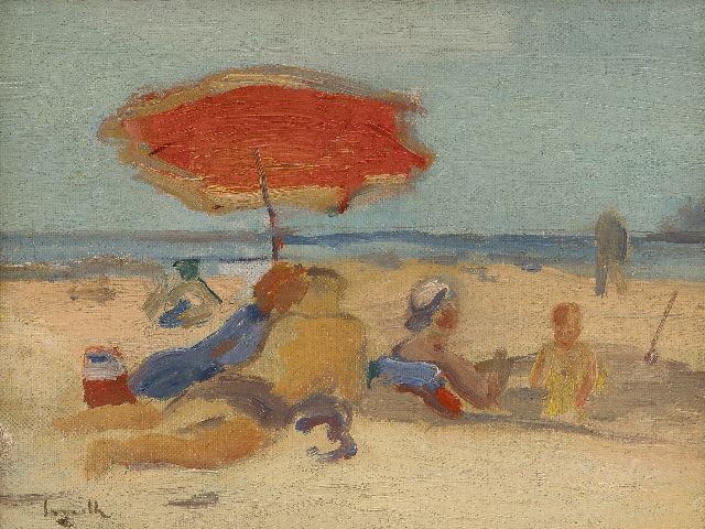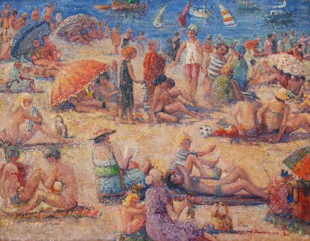 Willem Dooijewaard | Zonnebaden op het strand bij Nice, olieverf op doek, 32,3 x 43,2 cm, gesigneerd r.o. en te dateren ca. 1938