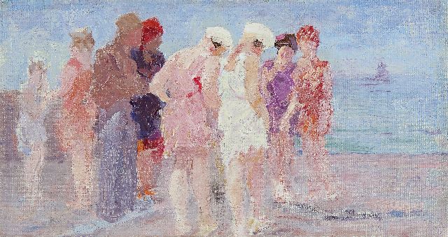 Emile Jacques | Strandgezicht met badgasten, olieverf op doek, 34,1 x 41,3 cm, gesigneerd l.o.