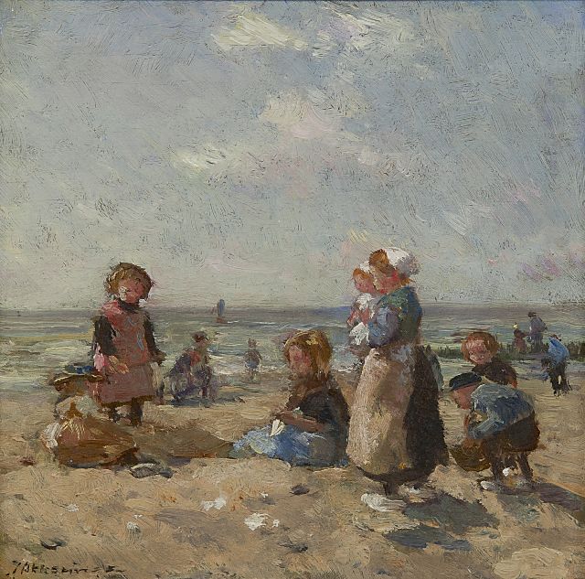 Johannes Evert Akkeringa | Spelende kinderen op het strand van Scheveningen, olieverf op paneel, 16,3 x 16,8 cm, gesigneerd l.o.