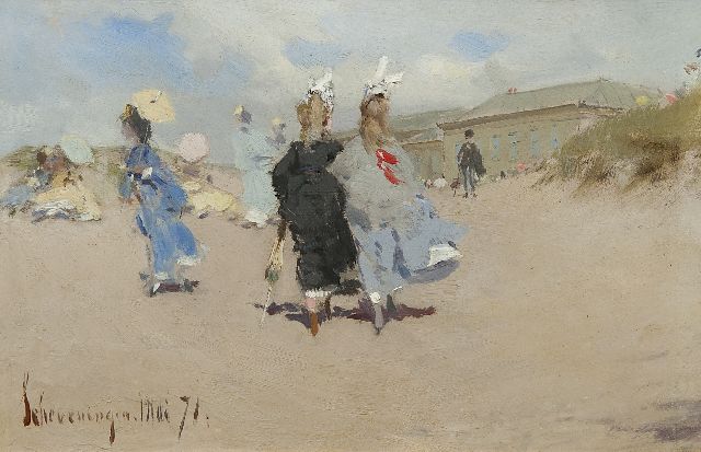 Frederik Hendrik Kaemmerer | Elegante dames op het strand van Scheveningen, olieverf op board, 15,5 x 24,0 cm, gesigneerd l.o. en gedateerd 'Scheveningen' Mai '71