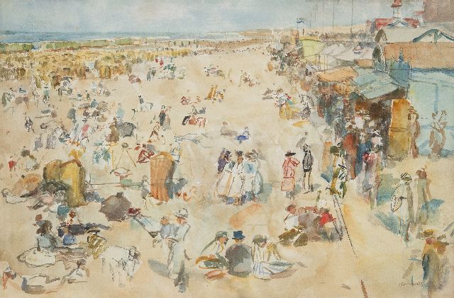 Isaac Israels | Een drukke dag op het strand van Scheveningen, aquarel op papier, 33,7 x 50,5 cm, gesigneerd r.o. en te dateren ca. 1920