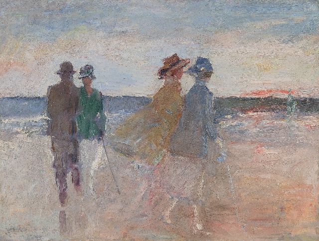 Jan Rinke | Wandelaars op het Scheveningse strand bij zonsondergang, olieverf op board, 30,1 x 40,2 cm, gesigneerd l.o. (resten)