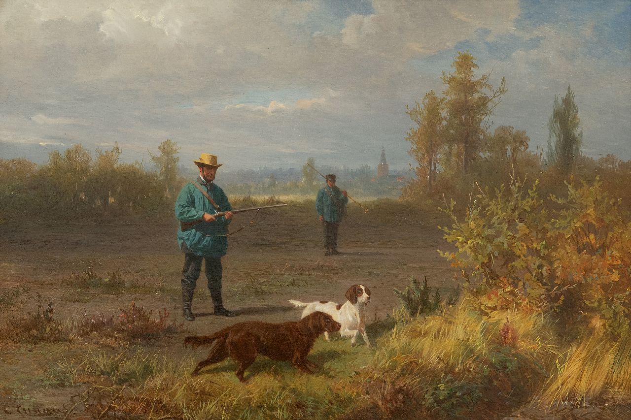 Conradijn Cunaeus | Jachttafereel bij Barneveld, de Oude Kerk in de verte, olieverf op paneel, 21,7 x 32,2 cm, gesigneerd l.o.