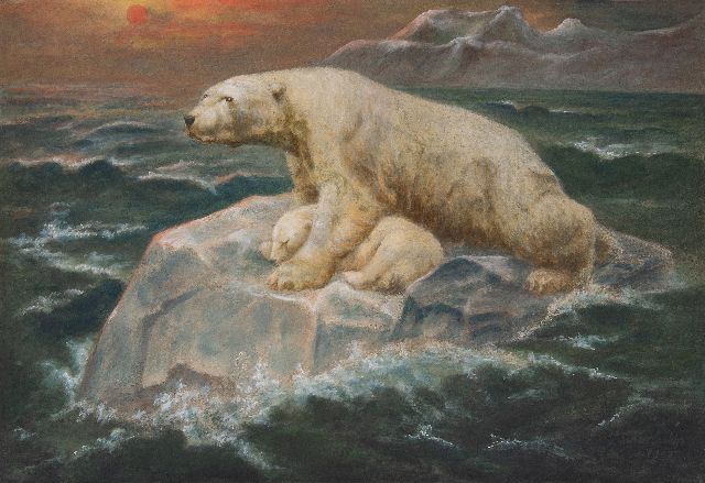 John Trivett Nettleship | IJsbeer met jong op ijsschots bij zonsondergang, gouache op papier, 47,2 x 69,9 cm, gesigneerd r.o. en gedateerd 1900