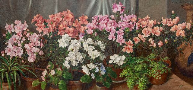 Willy Fleur | Stilleven van bloeiende azalea's op een tafel, olieverf op doek, 60,0 x 119,9 cm, gesigneerd r.b. en zonder lijst