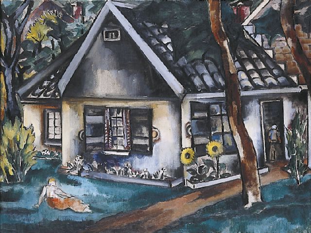 Alfons van Dijck | Zonbeschenen huisjes, St. Anna ter Muiden, olieverf op schilderskarton, 30,0 x 34,6 cm, gesigneerd r.o. en gedateerd 1923