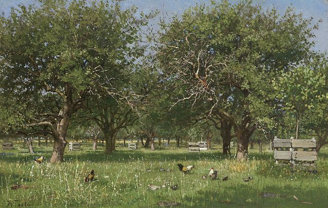 Willem de Famars Testas | Boomgaard met kippen, olieverf op doek op paneel, 22,4 x 34,9 cm, gesigneerd l.o. en gedateerd '81