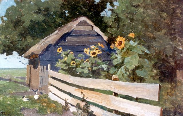 Joan Collette | Boerderij in de zon, olieverf op schildersboard, 28,0 x 31,9 cm, gesigneerd r.o. en gedateerd 1912