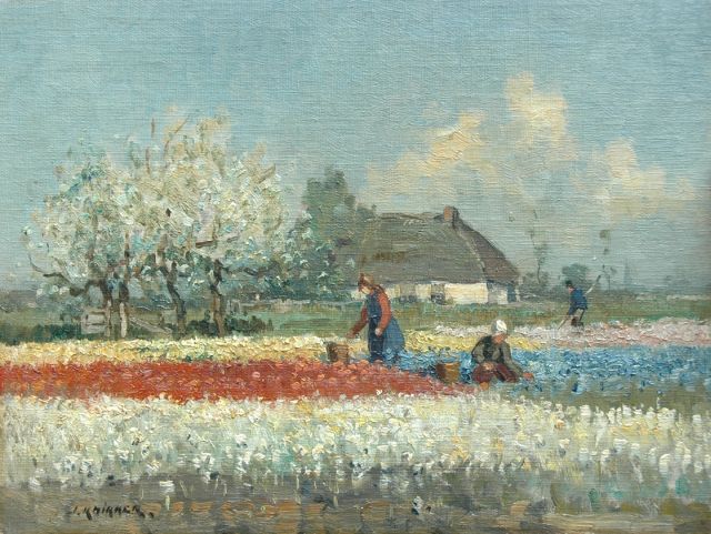 Anton Dirckx | Boeren in een bollenveld, olieverf op doek, 23,5 x 33,0 cm, gesigneerd r.o.