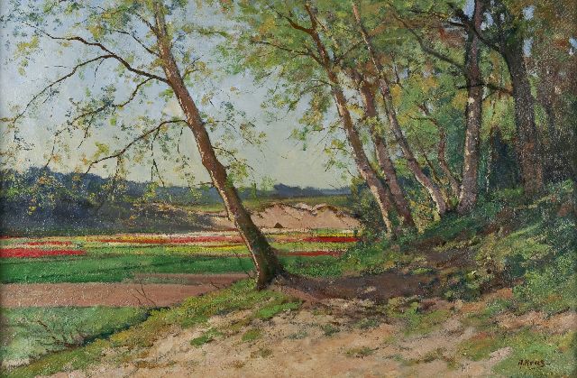 Adriaan Keus | Bosrand met uitzicht op bollenvelden, olieverf op doek, 54,0 x 81,2 cm, gesigneerd r.o.