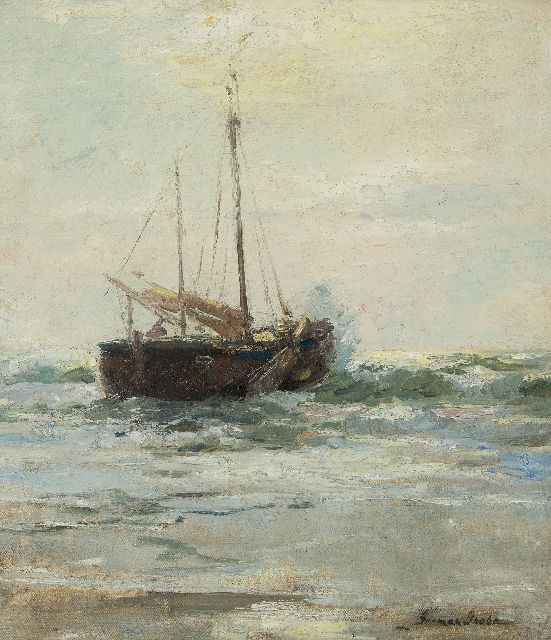 Jan Hendrik Weissenbruch | Bomschuiten aan de vloedlijn, olieverf op doek, 38,9 x 50,9 cm, gesigneerd l.o.
