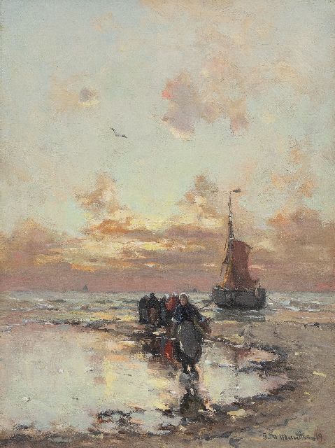 Morgenstjerne Munthe | Strandgezicht met vissers en bomschuit bij avondschemer, olieverf op doek, 40,3 x 30,0 cm, gesigneerd r.o. en gedateerd '19