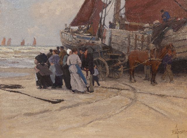 Hendrik Willebrord Jansen | Het vertrek van de vissers, Katwijk, olieverf op doek, 62,0 x 83,0 cm, gesigneerd r.o.