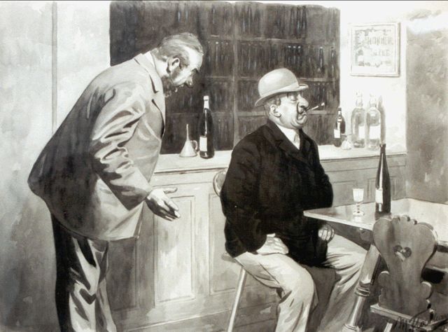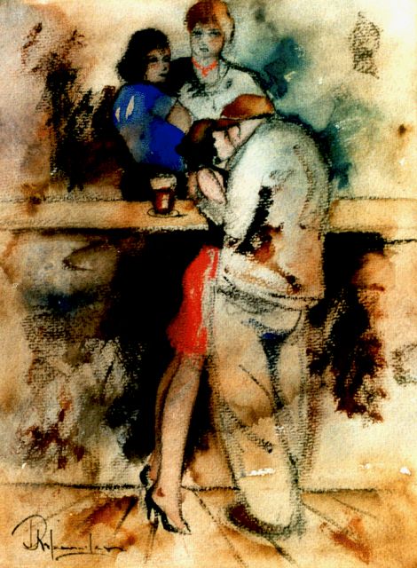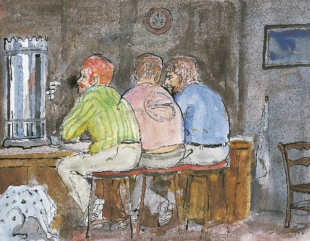 Harm Kamerlingh Onnes | Aan de bar, Oost-Indische inkt en aquarel op papier, 23,5 x 31,0 cm, gesigneerd r.o. met monogram en gedateerd '80