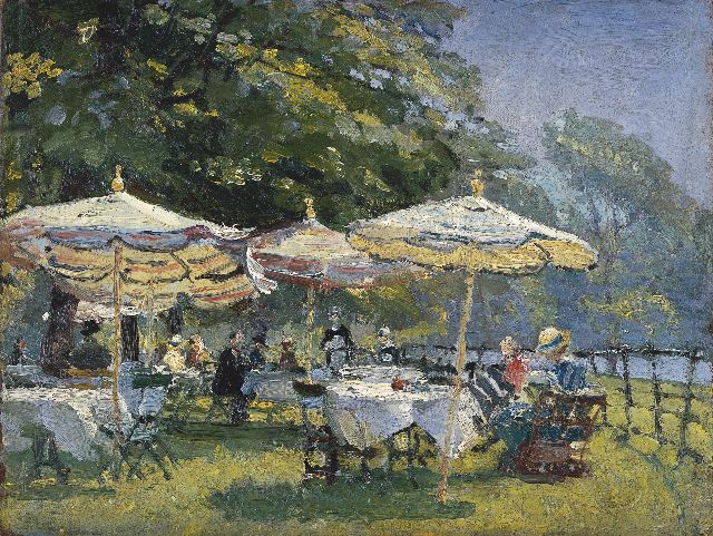 Johannes Evert Akkeringa | Theetuintje, olieverf op paneel, 18,0 x 25,2 cm, gesigneerd resten van signatuur