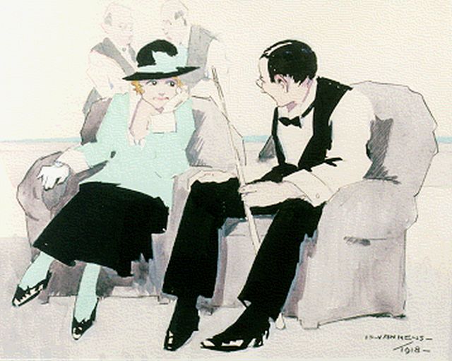 Is Mens | Gesprek in de clubfauteuils, aquarel op papier, 25,5 x 35,0 cm, gesigneerd r.o. en gedateerd 1918