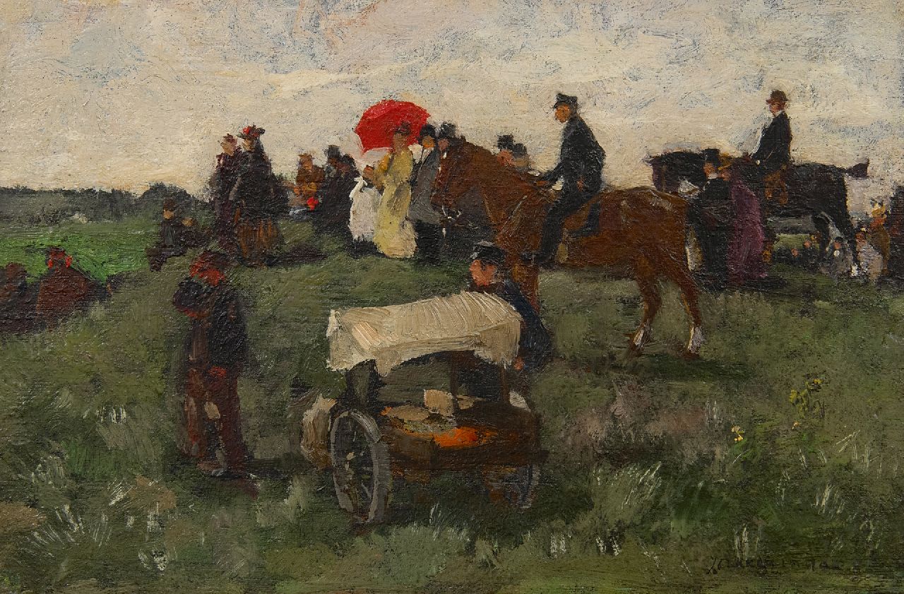 Johannes Evert Akkeringa | Bij de wedrennen te Clingendael, olieverf op paneel, 16,5 x 25,0 cm, gesigneerd r.o. en te dateren ca. 1898