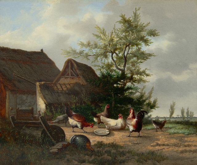 Jean-Baptiste Leopold van Leemputten | Boerenerf met haan en kippen, olieverf op paneel, 28,1 x 33,7 cm, gesigneerd r.o. en gedateerd 1863