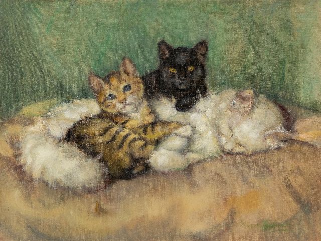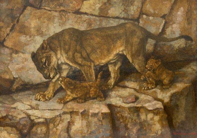 Herbert van der Poll | Leeuwin met haar welpen, olieverf op doek, 49,5 x 69,8 cm, gesigneerd r.o.