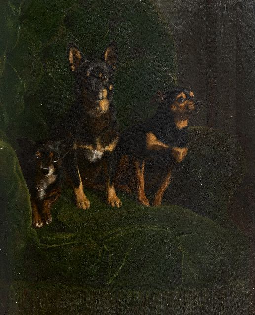August Le Gras | Drie dwergpinchers in groene stoel, olieverf op doek, 81,2 x 65,5 cm, gesigneerd r.m. en gedateerd 1888