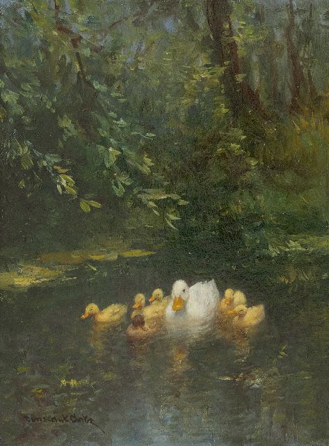 Constant Artz | Moedereend met zes kuikens in het water, olieverf op paneel, 24,0 x 17,9 cm, gesigneerd l.o.