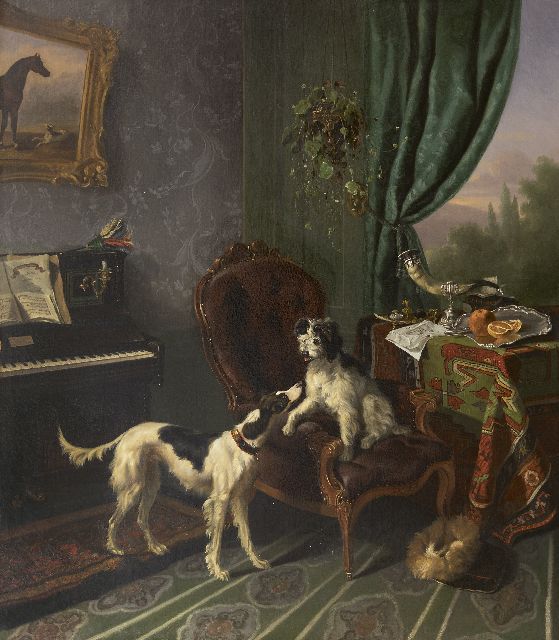 Wouterus Verschuur | Muziekkamer met twee honden, olieverf op doek, 90,0 x 79,0 cm, te dateren ca. 1848-1850