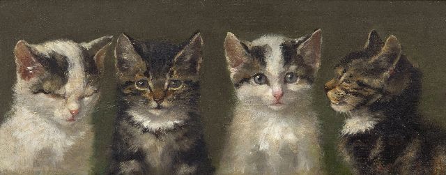 Anna Maria Kruijff | Vier poezen, olieverf op paneel, 14,7 x 36,3 cm, gesigneerd r.o.