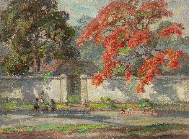 Ernest Dezentjé | Tuinmuur met bloeiende flamboyant, olieverf op doek, 40,3 x 55,1 cm, gesigneerd l.o.