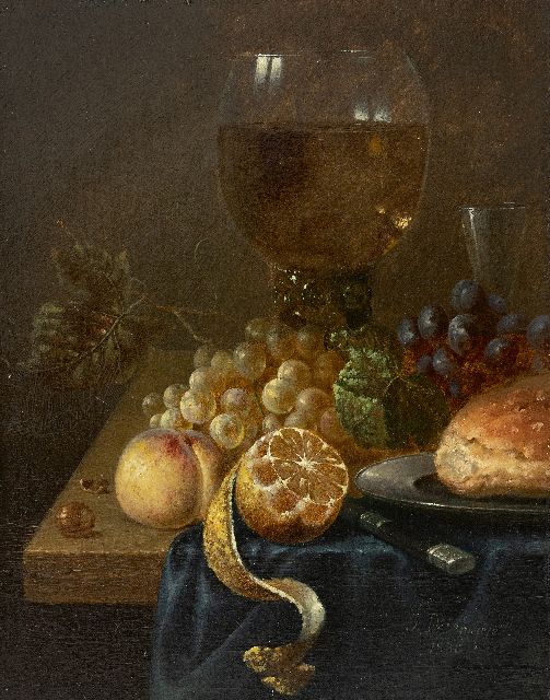 Stilleven met roemer, druiven, citroen en tinnen schotel