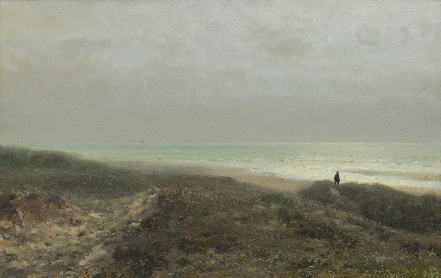 Johannes Josephus Destrée | Duinlandschap met wandelaar uitkijkend over zee, olieverf op paneel, 27,6 x 43,8 cm, gesigneerd r.o. en gedateerd 1879