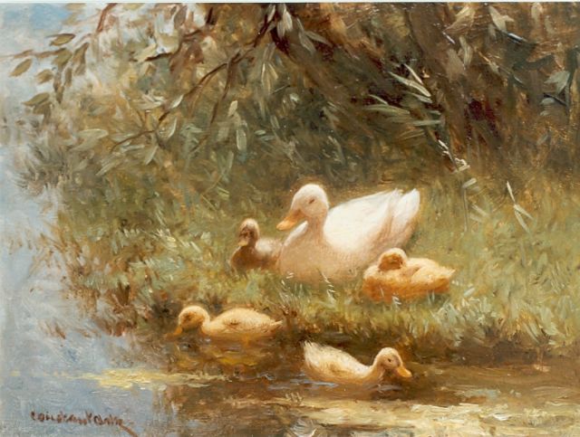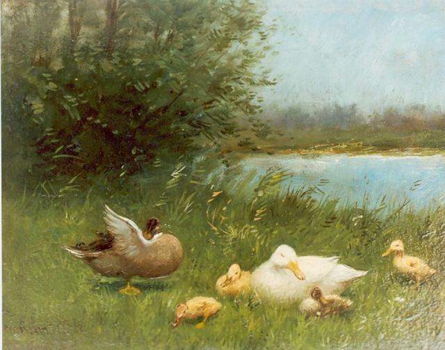 Constant Artz | Eenden met hun kroost aan de slootkant, olieverf op paneel, 18,8 x 25,0 cm, gesigneerd l.o.