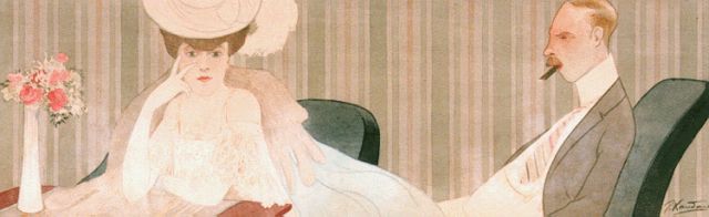 Joaquin Xaudaro | Modieuze vrouw met haar echtgenoot, aquarel op papier, 20,7 x 64,7 cm, gesigneerd r.o.