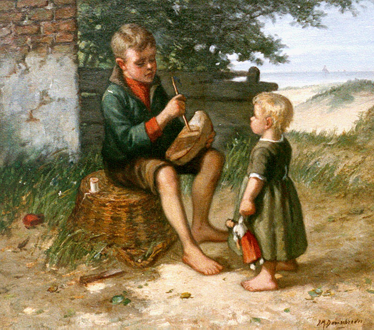 Jan Damschreuder | Jongen maakt zeilklompje voor zijn zusje, olieverf op doek, 35,4 x 40,4 cm, gesigneerd r.o.