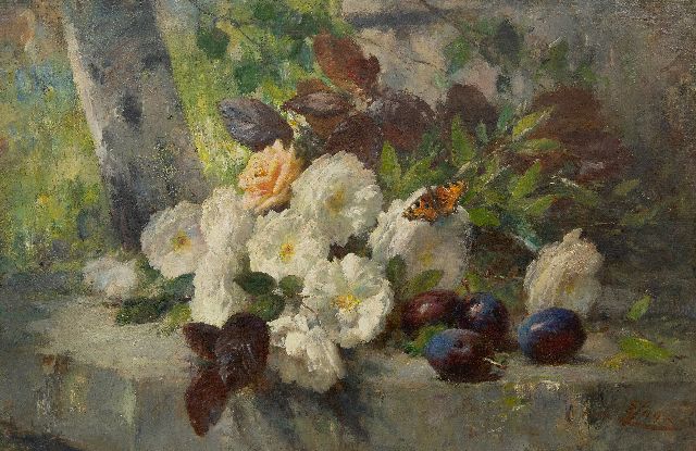 Stilleven met rozen, fruit en een vlinder